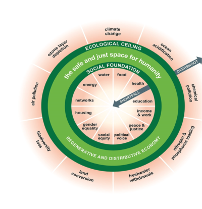 The doughnut economy is displayed in a visual circular schematic with a green inner circle, which represents a “regenerative and distributive economy that is a safe and just space for humanity” surrounding a list of items that, when in shortfall, need to enter the green doughnut’s “social foundation,” like housing, energy, water, health, income & work, etc. At the outer edge of the doughnut, an “ecological ceiling” lists “ecological overshoots” that threaten the social fabric.