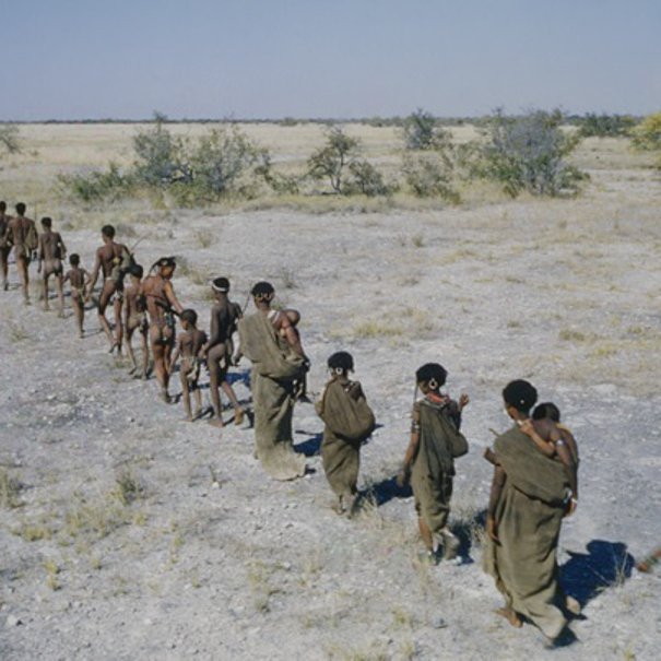 San hunter-gatherers walking across the Kalahari Desert in southern Africa. (Courtesy of L.K. Marshall and L.J. Marshall. Copyright President and Fellows of Harvard College, Peabody Museum #2001.29.390.)