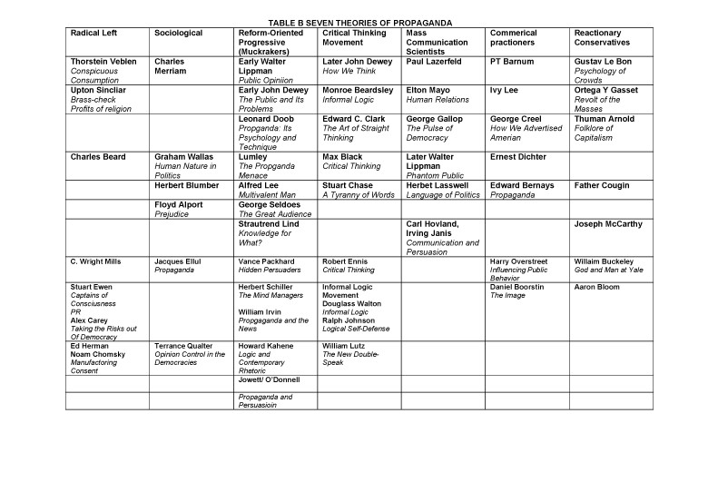 Please see Table B for a summary of the seven propaganda theorists and their books spanning from the 1920s to the 1960s.