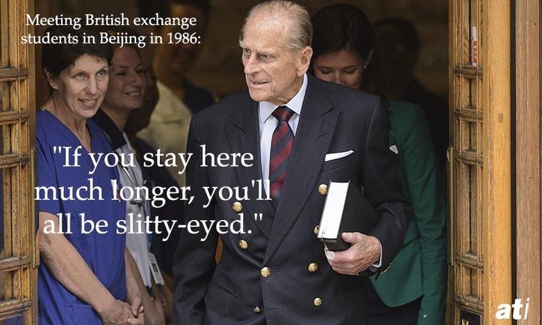 The Prince Philip treasury is laden with such remarks, the sort that inspired other family members such his grandson Prince Harry while enraging commentators such as Hamid Dabashi. To a Scottish driving instructor, the Duke of Edinburgh inquired how it was possible to “keep the booze long enough to pass the test.” To an Australian Aboriginal: “Still throwing spears?” To a group of British students on a royal visit to China: “If you stay here much longer you’ll all be slitty-eyed.”