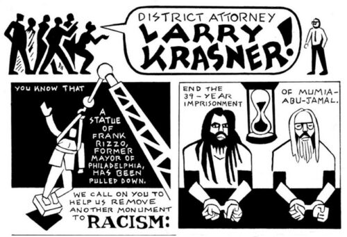 This is one segment of the original artwork created by longtime Mumia supporter Seth Tobocman to support our petition campaign. It is the centerpiece of Issue #1 and can be viewed on the Jamal Journal website.