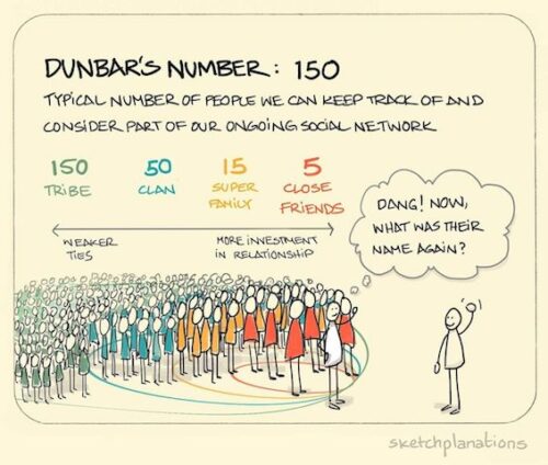 Before the advent of such digital dysfunction, the average human spent 192 minutes per day interacting — face-to-face — with other humans. Setting aside sleep time, that’s one-fifth of each day. Conversely, the average human in 2021 now surrenders about 153 minutes per day to social media usage. At this rate, it won’t be long before that reaches one-fifth of each day — fully reversing the hard-wired trend we require. And what happens during those 153 daily minutes on social media? Among many things, the robots put us in touch with far more humans than the infamous “Dunbar’s Number” allows.