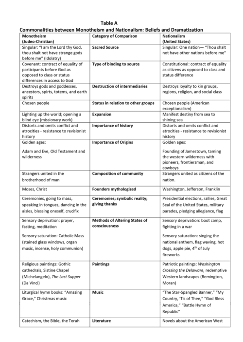 Let’s start with some definitions. Monotheism is a sacred system prevalent in stratified state societies with possible developing empires in which a single, abstract and transcendental deity presides over “chosen people” via a contract or covenant. Nationalism is a secular system which exists in capitalist societies in which a single nation claims territory regulated by a state. Before launching into a description of the commonalities, Table A provides a snapshot overview of where we are headed.
