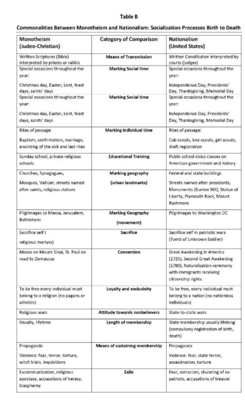 My article then takes a step further. I argue that the state uses a particular kind of religion to strengthen its loyalty. It is no accident that the countries of the world that never developed nationalism in the 18th and 19th centuries were not Jews and Christians. There is something about the monotheism of the Jews and Christians that was the best foundation to build nationalism and the centralized state that developed in Europe in the 19th century. Most of the rest of my article shows the similarities in the beliefs and dramatization between monotheism and nationalism. Lastly, I close with a table that shows how similar nationalism and religion are in their socialization processes from birth to death. I also addressed the question of why Islamic monotheism did not lead to Islamic nationalism.