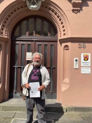 Before the digging began at the fence and under the screaming jets, a police detective called my name and with some ceremony served me with papers from the court informing me that I had been accused, convicted and sentenced to a 900 euro fine or 30 days in prison in response to my actions on my last visit to Germany and to Büchel, two years ago, along with two others, Susan from California and Susan from Amsterdam. It was decided by the court that “through the same act and acting collectively” and “within the scope of the annual meeting and demonstration against nuclear weapons at the airbase of fighter-bomber squadron 33,” I had “gained unlawful access to the military area and its security sector” by cutting holes in the fence. I remember that the military police sergeant who apprehended us was unreasonably upset about the hole we had made, not so much concerned about the weapons of mass destruction that he was guarding nor the violations of the German Constitution and the Nuclear Nonproliferation Treaty that they pose. Before leaving Germany, I filed an appeal of my conviction and sentence in the court at Cochem and I hope for the opportunity to argue against the assumed legality of nuclear weapons in a German court.