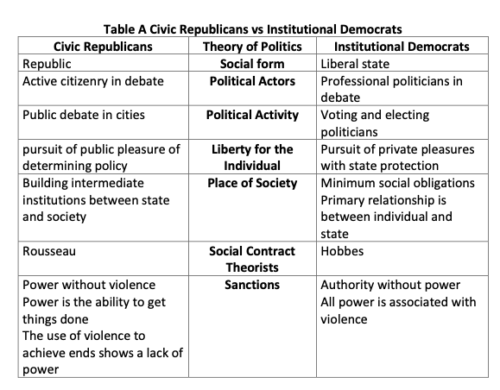 If the institutionalists ideal is a liberal democracy, for civic republican theoreticians the ideal is a republic. Civic republicans are broader than institutionalists in that the ultimate political actors are an active citizenry, rather than professional politicians. The place where this active citizenry engages is not in elections but in public debates, with or without legislative bodies. Lastly, each has a different conception of individual liberty. For democratic institutionalists, liberty for the individual is to engage in private pleasures and guaranteed protection from the state. This is rooted in Hobbes version of a social contract as an agreement between miserly, self-subsisting individuals. For civil republicans, following Rousseau’s version of the social contract, the ultimate liberty is politics in public discourse using rational persuasion. Please see Table A below.