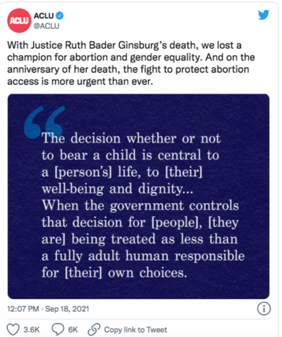 Last month, to mark one year since the death of a female icon, Ruth Bader Ginsberg, the American Civil Liberties Union (ACLU) shit all over her memory with a misogynist tweet (below). The once-revered ACLU has become so #woke that they now ban words like “women” and “she” and “her” in the name of virtue signaling.