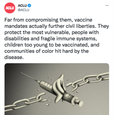 Then check out another hypocritical tweet to witness how the ACLU has fully sold out by supporting authoritarian (and anti-science) vaccine mandates. So much for these cowards standing up to “government overreach.”