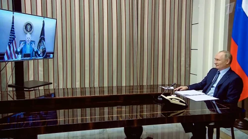 It was notable too that Putin was photographed seated at a table on his own to engage with the U.S. president while Biden was accompanied in the Situation Room with four aides, including Antony Blinken, who were obviously present to support or prompt the titular commander-in-chief. The TV monitors appeared to show the two presidents in a face-to-face encounter, but out of the screen view were the four aides to Biden.