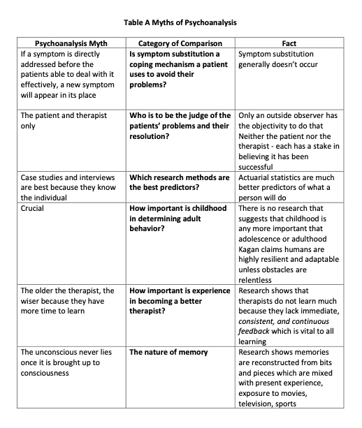 Table A below shows the most important myths of psychoanalysis that Dawes points out: