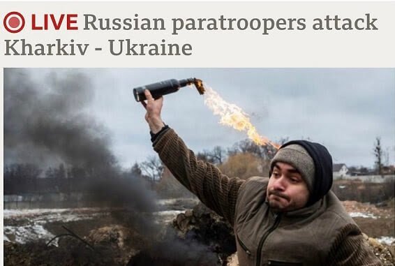 For the entire morning of March 2, the BBC home page featured a Ukrainian civilian throwing a lit Molotov cocktail. The adjacent headline: