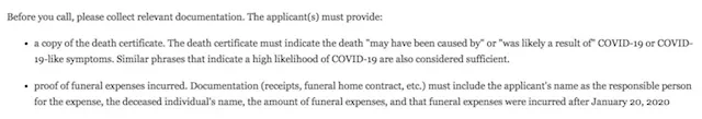 To apply for funeral reimbursement, you must provide “relevant documentation,” e.g. “a copy of the death certificate.” This certificate, we’re told, “must indicate the death ‘may have been caused by’ or ‘was likely a result of’ COVID-19 or COVID-19-like symptoms. Similar phrases that indicate a high likelihood of COVID-19 are also considered sufficient.”