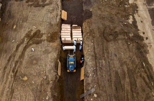 Drone picture show bodies being buried on Hart Island where the Department of Corrections is dealing with the COVID-19 “outbreak” in New York City, U.S., April 9, 2020. (REUTERS/Lucas Jackson)