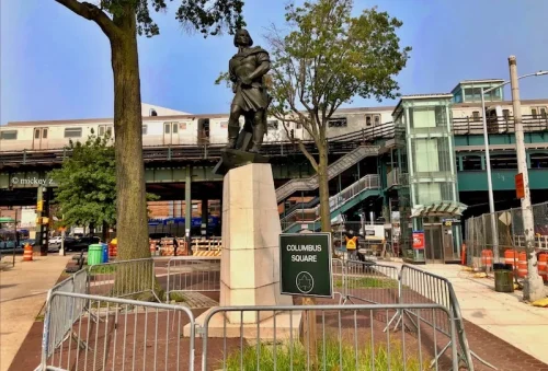 The cast iron statue was built just before World War II by Italians living in Astoria, but could not be erected because they didn’t have enough money for the statue’s base. The statue was dedicated on October 12, 1941, but, by the fall of 1942, was moved to a city warehouse. Fearing the scrap metal drives of WWII, it was hidden away in the basement of the Queens Borough Hall. In 1945, the statue was reinstalled in its current location.