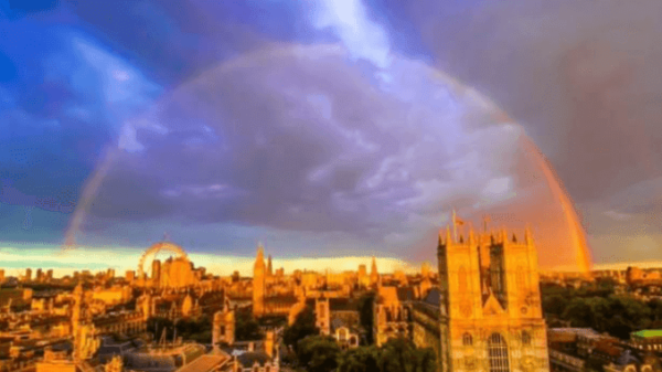 ‘The BBC’s Sophie Raworth caught the reaction of people who spotted the rainbow as she noted on Sunday: “As the sun set over Westminster tonight… the crowd gasped.”’