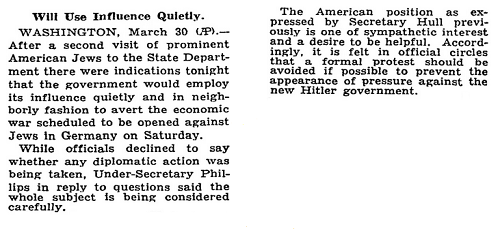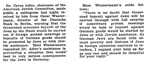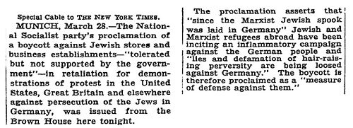 We being Jews ourselves are astonished and disgusted with this propaganda against Germany, being based on absolutely untrue statements. The news of cruelties, murdering of Jews, men and women, etc., are perfect lies from beginning to end. This news comes from and is spread abroad by certain traitors, literary men, who fled from Germany when the National Government was formed, and is supplied by communistic circles. ((Nadan Feldman, “The Jews Who Opposed Boycotting Nazi Germany,” April 20, 2015, Haaretz.))