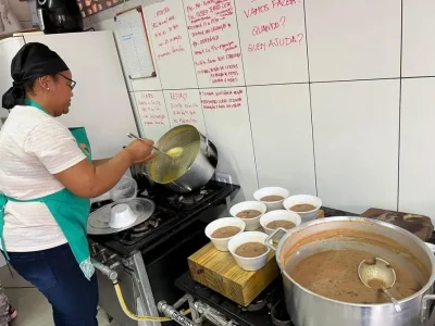 We spent some time at Academia Carolinas an educational center, community gathering space, and soup kitchen run by the MST at the Cidade Triadentes Guaianases (an hour’s drive from central Sao Paulo). They treated us to a delicious meal cooked with locally grown organic produce. Our host from MST was Simone Rego, and our chef was Rosana Oshiro. Rosana, an expert in Permaculture, frequently cooks at the center. Academia Carolinas provides food to community members once per week.