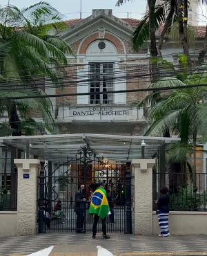 Colegio Dante Alighiere, Man wearing flag symbol of support for Bosonaro (Photo: Lauren Smith)