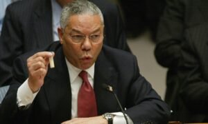 File photo of US Secretary of State Colin Powell holding up a vial as he addresses the UN Security Council. (Photo by Timothy A. Clary / AFP)