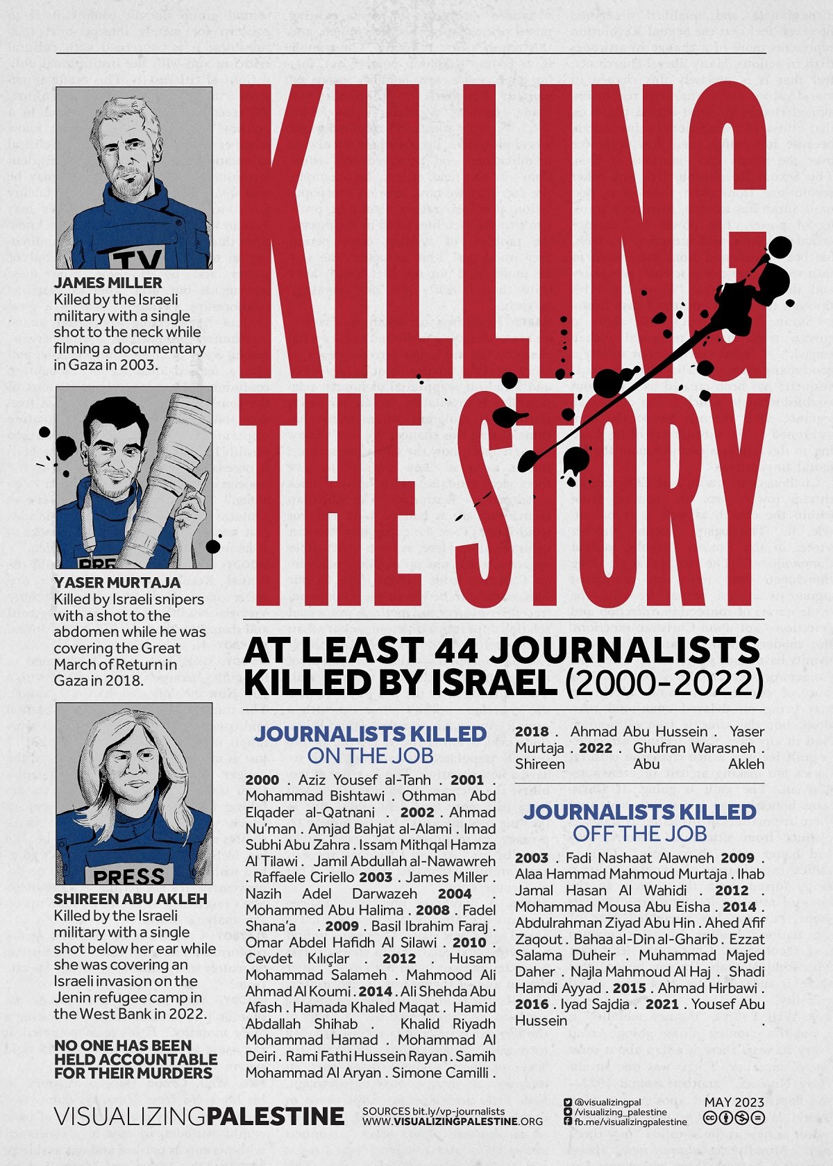As part of our ongoing series on freedom of expression, we recognize that Shireen’s case is not an anomaly, but reflects decades of Israeli impunity for the systemic targeting of journalists. This visual honors the journalists who were killed simply because their voices exposed the atrocities of Israeli settler colonialism and apartheid.