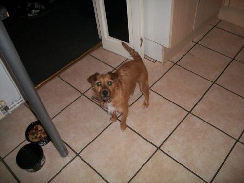 * Juju is a little, brown terrier dog who I travelled 230 odd miles back home to get from the Red Light Area at the edge of Gangland Territory… when she was just 7 weeks old and covered in fleas. The ‘Runt’ of the litter, no-one wanted her until I saw her… she’s been with me ever since, and is 13 years old this coming July. We were born within a mile of each other, and are both Welsh Gypsies. She’s done two stints in Dog Jail so far… little Bastard.