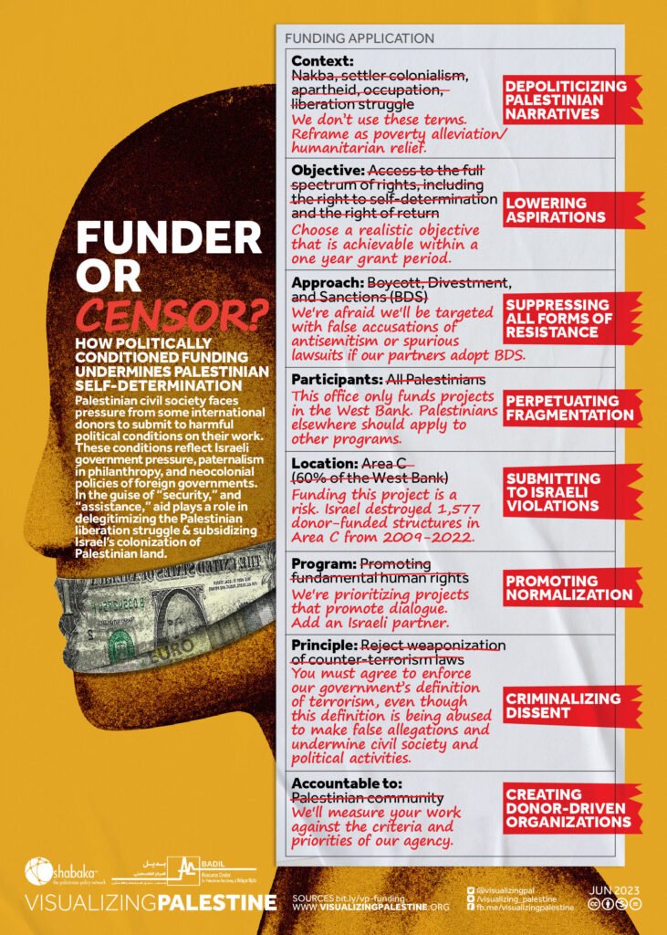 Over the last two decades, funding in Palestine has become tied to ever-increasing restrictive conditions that are used to control and limit Palestinian civil society. We partnered with Al- Shabaka and Badil to produce the visual illustrating how restrictive funding supports Israeli colonial policies, depoliticizes Palestinian society, criminalizes resistance to Israeli colonization, and thwarts Palestinian aspirations for self-determination. We created this visual to serve Palestinian organizations that are engaging with donors toward the creation of less harmful, more liberatory funding models.