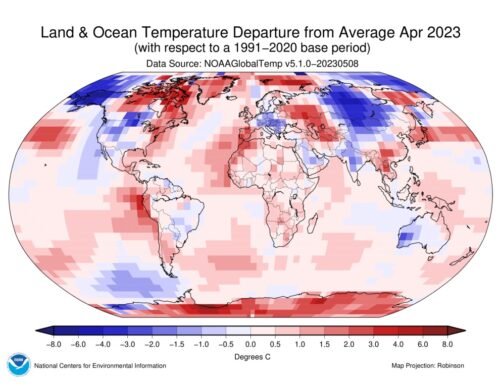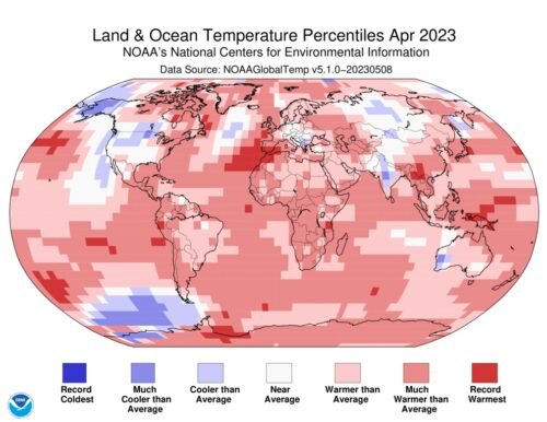 TEMPERATURE DEVIATIONS FOR LAND AND SEA, APRIL 2023 relative to the temperature normal, the average for the years 1991–2020. In this map, which uses a clearly indicated and color-coded temperature scale that the scientists themselves use, the temperature deviations we reported about over the last few months from North and South America, Central and Eastern Europe, and Central Asia, with hard-hit Mongolia, India, and Australia, are confirmed. This is despite the fact that critics argue it consistently shows higher temperatures due to non-representative and then tampered with measurement data. Source and map: NOAA