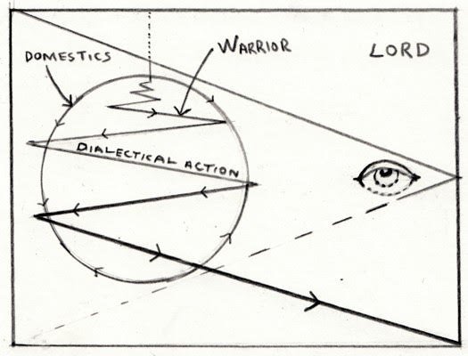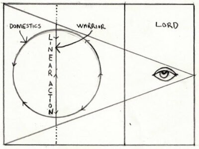The ‘warriors’ and the ‘domestics’ are watched over by the ‘lord’ (the all-seeing eye). This basic scenario is common to much of cinema narratives from early cinema to today’s blockbusters. The ‘warrior’ is the active protagonist upon which the narrative is focused, while the ‘domestics’ in general facilitate or impede the progress of the ‘warrior’ protagonist. The important point in this scenario is that the protagonist is ultimately working for the ‘man’; e.g., criminal gangs, mafia dons, the bourgeois government, the deep state, secret services etc. – to defend the state, not to overthrow it.
