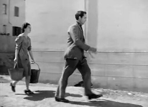 The same type of action is played out in the later Italian Neo-Realist film, The Bicycle Thieves (1948). The protagonist meets with his wife telling her he needs to get a bicycle to secure his new job offer. He marches on ahead of her, only stopping when his wife (who is carrying two buckets of water) needs help to walk down a small incline, and then marches off forcefully again. As the ‘warrior’, he engages with the ‘domestic’ only when his help/action is needed but he is mainly concerned with his problem of securing a bike so he can secure a wage and an income for his family. The drudgery of her ‘domestic’ role is in sharp contrast to the ‘action’ of his linear ‘warrior’ role.