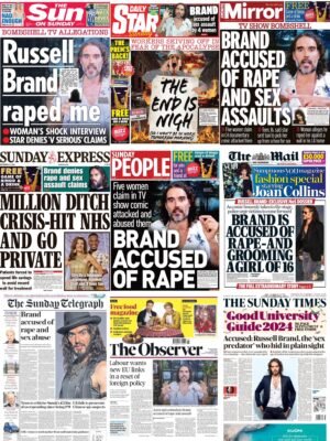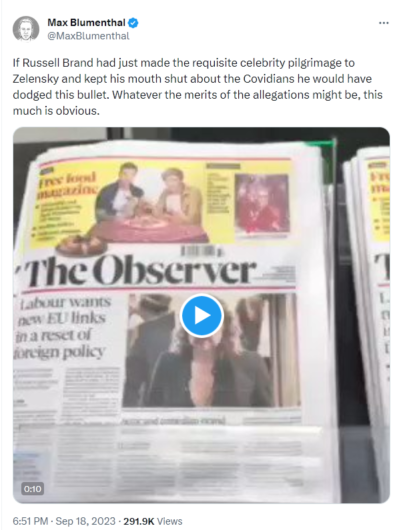 Oh, and regarding Russell Brand. I don’t know Russell Brand. I have absolutely no idea what he has or hasn’t done. Neither do you, probably. Which is not the point. The point is the current global-capitalist crackdown on dissent, which is in full-swing. Russell Brand is just the latest head on a spike, alongside the heads of Assange, Snowden, Trump, Corbyn, Carlson, et al. They are greasing up a spike for Bobby Kennedy’s head, and the head of anyone else who challenges them, even people that no one has ever heard of, like me.