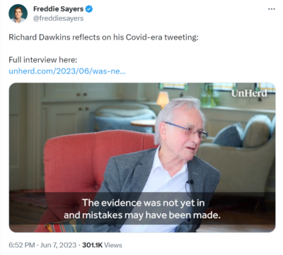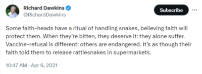 If you’re wondering about exactly who qualifies as a “Divisive Person” in the coalition … well, certainly not Very Important Persons like Richard Dawkins, who in 2021 compared folks who “refused” the Covid “vaccines” to “faith-heads releasing rattlesnakes in supermarkets”…
