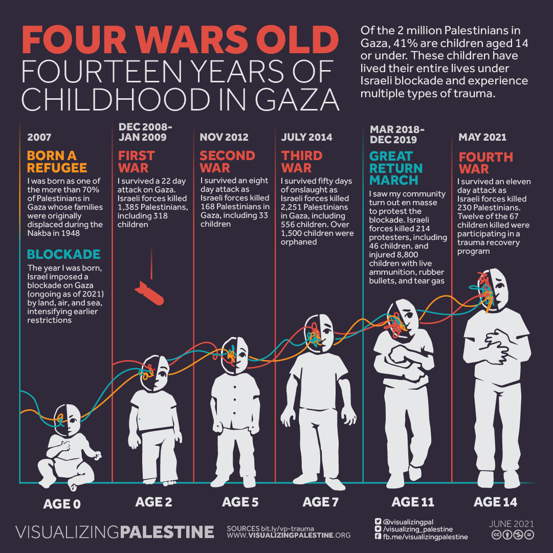 At least 90 Palestinian children have been killed by Israel’s assault on Gaza so far. This visual tella the story of Palestinian children in Gaza, who have experienced multiple assaults and multiple types of trauma since 2007, leading to a widespread mental health crisis among youth.