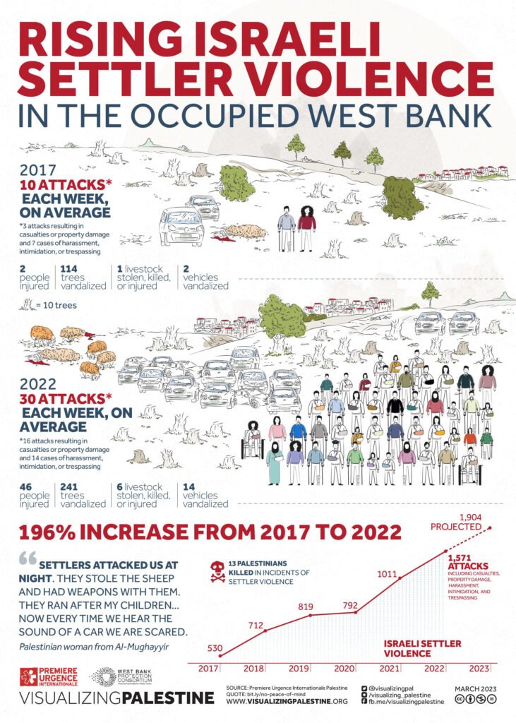There was a 196% increase in acts of Israeli settler violence from 2017-2022, with an even more alarming projection of the rise of settler violence in 2023. This visual tells the story of long-running impunity for escalating human rights violations against Palestinians.