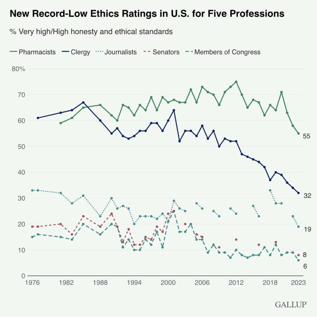 Line Chart: Ethics ratings for five professions in the U.S., 1976-2023.