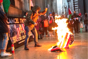 Photo caption: U.S. Marine and Afghan War veteran Zachary Kern burns his medals and a paper flag at anti-genocide “Cancel the DNC” rally 3/22/24 in Chicago.