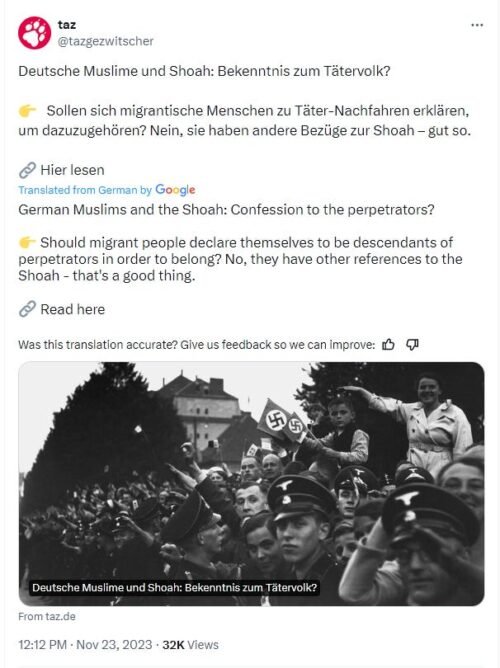 Oh, and speaking of inadequate “clarity” and “obviousness,” and the displaying of swastikas on German Twitter, here’s a Tweet by Die Tageszeitung, the big “left” newspaper here in Berlin …