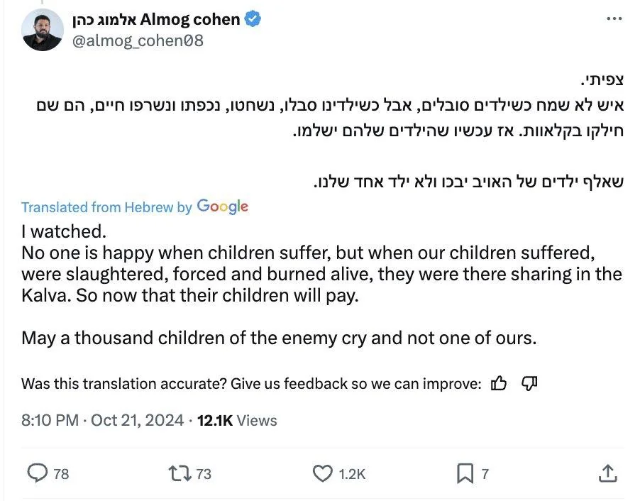 X/Twitter screen cap from Almog Cohen. He is perpetuating lies about the 10/07 attack to justify targeting and killing of Palestinian children.
