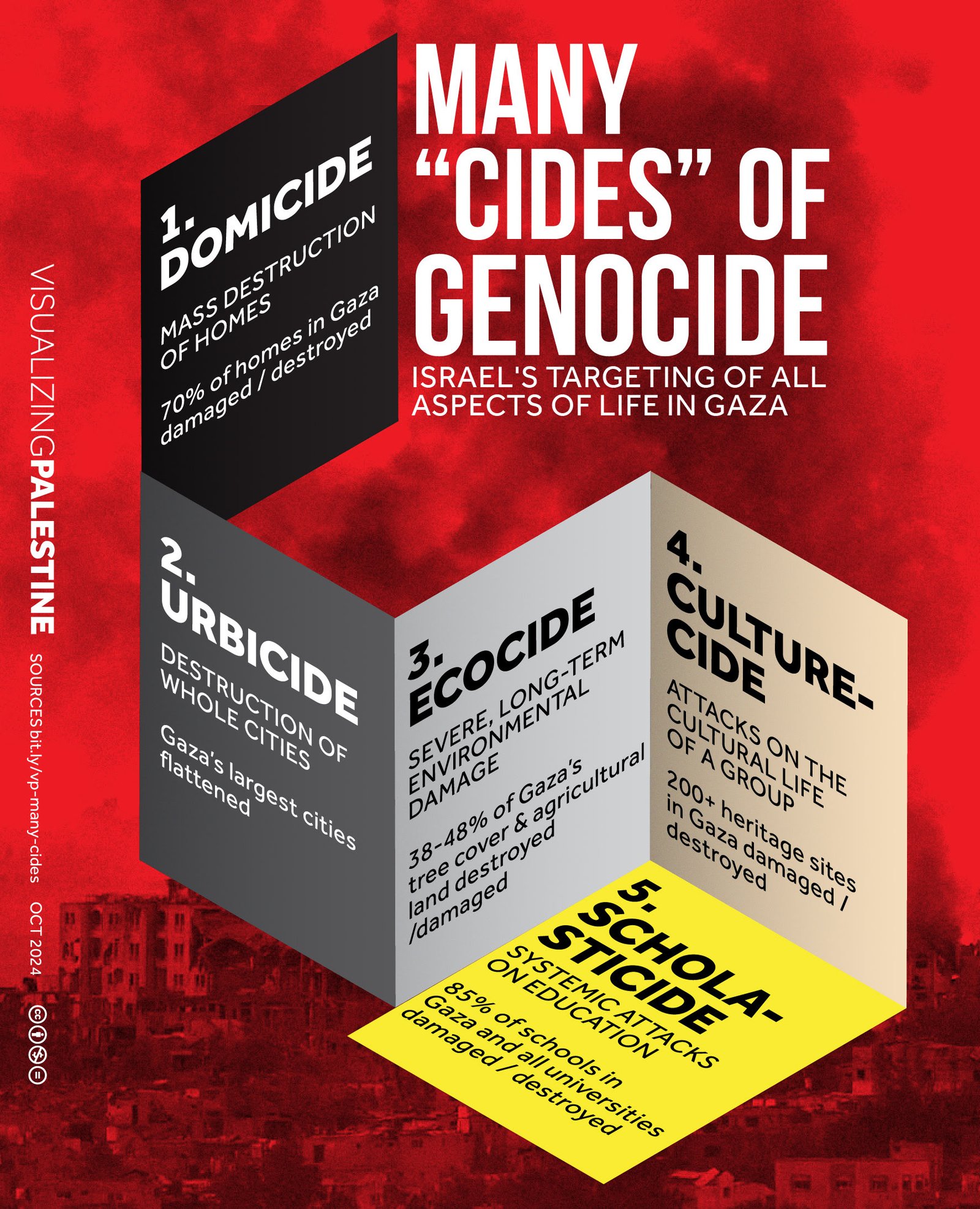 The many “cides” encapsulated in this visual capture the multifaceted nature of this genocide, which will impact Palestinians for generations.