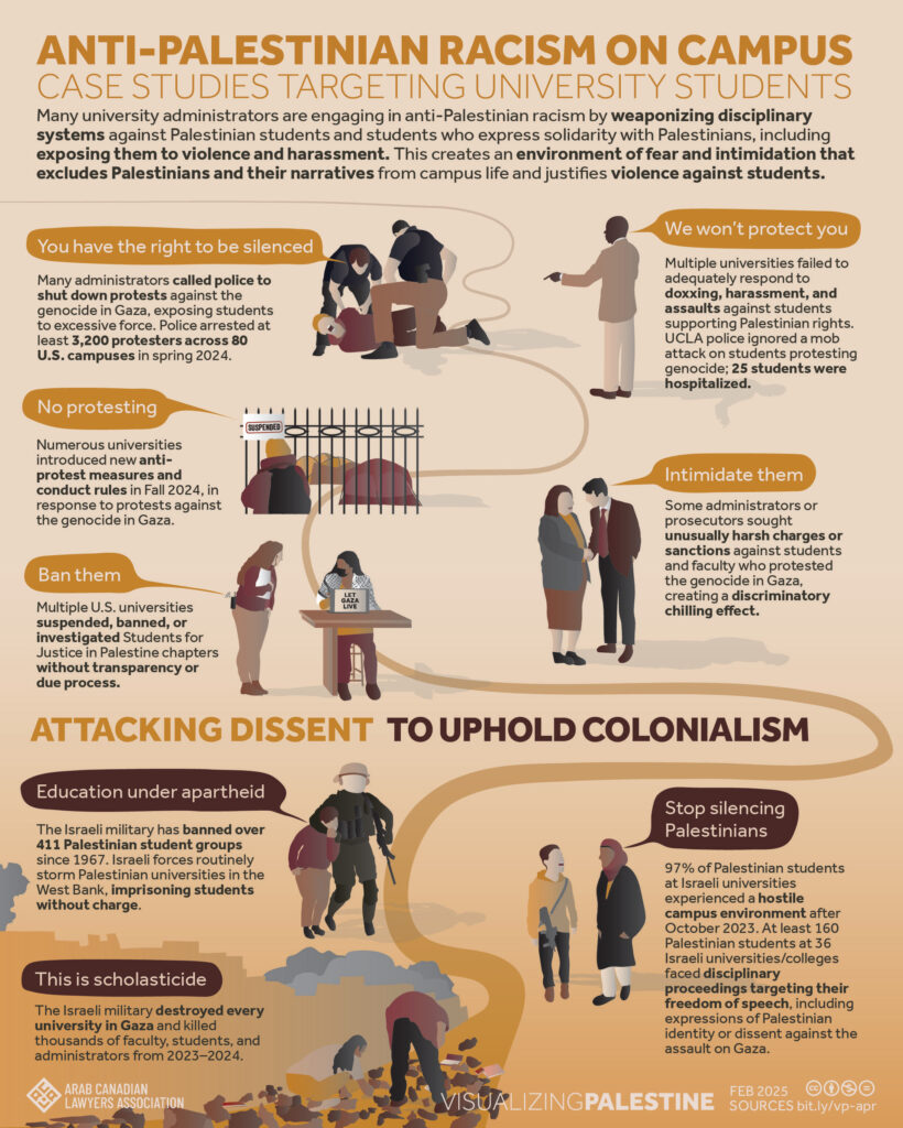In the midst of growing repression faced by Palestinians and supporters of Palestinian freedom, the VP team has worked on a new visual that focuses on the repression of Palestinian students and students who express solidarity with Palestinians on college campuses. This visual was created in partnership with the Arab Canadian Lawyers Association.