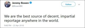 Try to find the above points being made in a BBC article or news broadcast by Bowen or any other BBC journalist. When do they ever explain that it is Israel who repeatedly breaks ceasefires? When do they ever report that there is a long history of Israel, with US connivance, repeatedly blocking moves towards a just and genuine peace in the Middle East?
