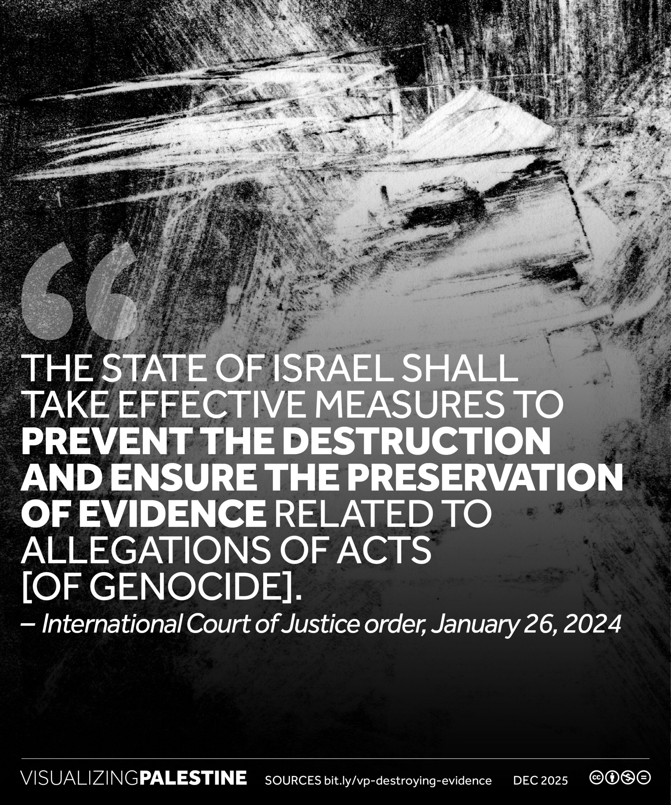 Since the International Court of Justice ordered Israel in January 2024 to prevent destruction and ensure the preservation of evidence related to allegations of genocide, Israel has instead continued to act with impunity. Israeli forces have escalated attacks, even during the so-called ceasefire, demolished large areas of the Gaza Strip, continued to bar international journalists from entering Gaza while assassinating Palestinian journalists, and refused to cooperate with international fact-finding missions. The bodies of thousands of Palestinians, both recently killed and long buried beneath debris, remain unrecovered.