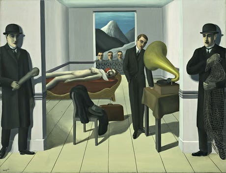 Human history is a crime scene, as limned by René Magritte – in his painting The Menaced Assassin (1927)