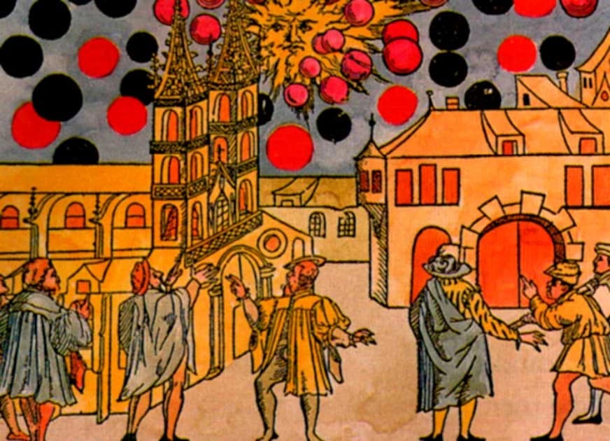 A woodcut, carved in Basel in Switzerland in 1566, depicts an episode of bizarre aerial activity. Black globes were described traveling with immense velocity and eclipsing the sky and the sun. (Samuel Coccius / Public Domain)