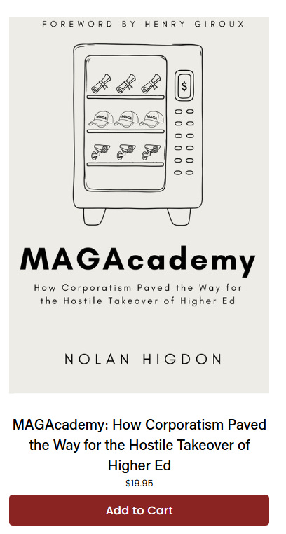 “Higher education is in crisis, but not exactly for the reasons that seem to garner the most attention in our fickle, mediated world. A veteran “road” scholar, Higdon writes accurately and scathingly about the neoliberal professional managerial class of opportunists, careerists, and virtue signalers who executed a slow motion controlled demolition of the academy from the inside. I’ve lived it and seen it up close for 25 years and this book simply nails it, sometimes hilariously (because no one should have to cry all the time). Corporate grifters have no place in higher ed. Masterfully framed with a foreword by critical scholar Henry Giroux, and bookended with real and achievable proposals to rebuild education in the public interest, Higdon’s MAGAcademy is a must read for anyone concerned with the future of education and critical scholarship not to mention democracy itself.” — Mickey Huff, Distinguished Director, Park Center for Independent Media; Professor of Journalism, Roy H. Park School of Communications, Ithaca College; Executive Director, Project Censored; and President, Media Freedom Foundation