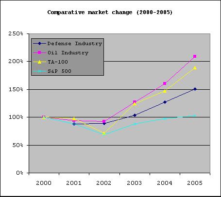 We need to assess the success of three segments within the U.S. centered ruling class, the oil industry, the defense industry, and the economic and political leadership of Israel. That can be approximated through relying on common stock market indexes. We need to chose indexes for the stock market performance of each segment, compare the three among themselves, and more importantly, to the broad U.S. market. The comparison answers a simple question. Have the fortunes of each of the three groups involved in pushing for war in Iraq improved or declined since the war began? The results are visualized in the simple chart below. Clearly, all of our three groups of warmongers have done well, significantly better than the broad capitalist class. Among the three, the oil industry is the big winner, and Israel’s ruling class a close second.