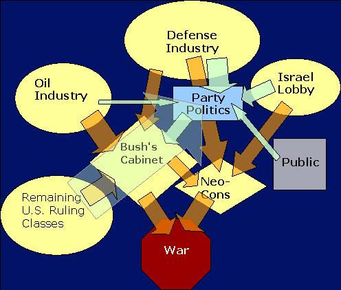 Three observations are needed to finish the picture. First, the defense industry is the dominant economic force in Washington, a position that is inherently tied to the size of the defense budget. Cheney, Bush and many other top officials have deep ties in the defense industry. [3] Second, it is a mistake to view the connection to Israel as a purely ideological affair. In so far as it is a factor in American politics, “Israel” stands for the small elite of military, business and political figures with close ties within the U.S. Third, there is a silent element in this picture: the larger part of the U.S. ruling class outside the directly involved industries. While there is no evidence I am aware of there has been a push for war outside the oil and defense industries and the Israel Lobby, it is quite improbable that the war could have be launched without at least the tacit acceptance of the broad corporate/capitalist class. [4]