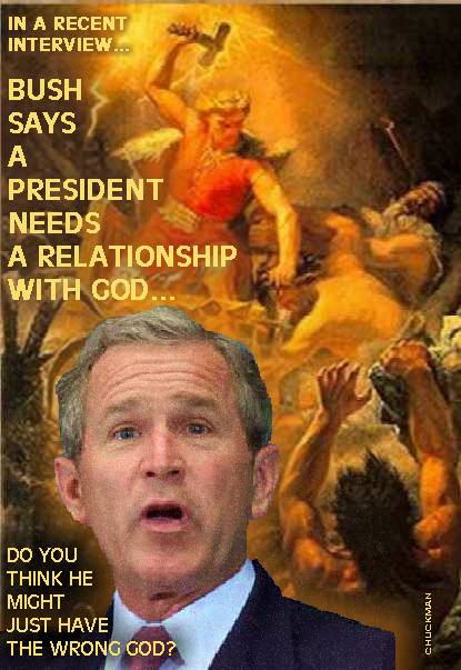 Since November, Christian fundamentalists have been flourishing their alleged popular mandate for taking America back to the days of forced prayer, heresy laws, and witch hunts. The media trumpets to High Heaven that it was good Christian folk with solid “moral values” who put the born-again Chimpster back in office. Now the fundies are aggressively pushing their retro agenda on rabidly approving Republican toadies and meek opposition Fraidy-crats. The ink wasn’t even dry on the gift checks before fundies were everywhere screeching about the Pledge, the Ten Commandments, evolution, Intelligent Design, gays, Christmas, and the horrible oppression they suffer at the hands of secular liberals and other assorted communist sympathizers (gag!). Their sick goal, of course, is nothing short of a medieval Christian America with their highly perverted version of the Jesus myth explicitly codified right into the fabric of America’s legal, political, educational, and judicial systems. Till then, they insist, we’re not supposed to call them “stupid”. They won, so they’re not stupid. The President’s one of them; they’re not stupid. They’ve got “moral values”; not stupid. They clinched the election. Stupid? Not. If stupid is as stupid does, then if they’re as stupid as I, oh so politically incorrectly, think they are, then they should have given themselves away in spades by now, leaving behind legions of reality-based disbelieving head-scratchers like me. Check it out. The Creationism/Evolution “Debate”Considering we’re the only country in the world who wastes so much oxygen on this issue and that any serious scientist without a faith-based funda-botomy has been firmly on the side of evolution for decades, this one doesn’t look good for the righties. Despite their clever transition from IC (Insane Creationism: that’s the ol’ “the Earth is 6,000 years old” crap) to ID (Intelligent Design: that’s the “the human eye is so wonderful and perfect, it couldn’t develop randomly” crap), they still don’t see the basic fact that Creationism is light years from being science and evolution is infinitely more than the mere speculative theory they try to denigrate it as. I suppose this makes sense given that the collective scientific ignorance of both messenger and recipient are off the charts.