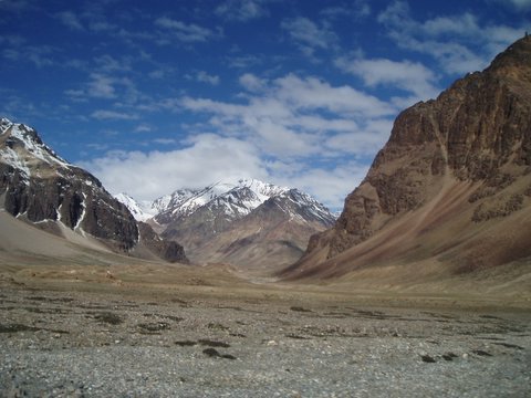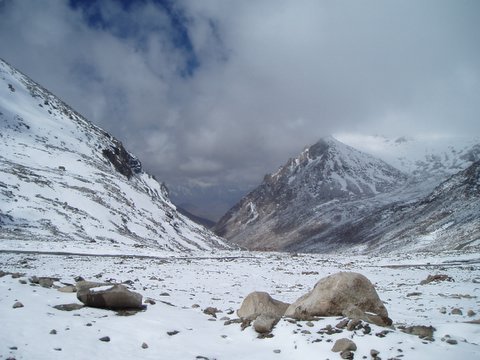Sarchu Plain (photo: Krista Roessingh) After a long winding climb through glacial moraines to the top of the 16,000 ft. Baralacha La, we descended to the virtually uninhabited and treeless Sarchu Valley. Several "parachute camps" are set up on the wide plain at the base of the valley, which cater to the truck traffic and to bus passengers travelling between Manali and Leh who overnight there. At 14,000 ft., in this windswept and lonely place, we checked in at a police outpost and stopped for the night. There are no latrines provided for the thousands of people who pass through for four months every year, nor is there any provision for the tons of garbage this traffic produces. Except for a single tiny village, nomadic yak, sheep and goat-herders and their flocks are the only visible living presence out on the plain. The valley was once a major thoroughfare for itinerant traders and pack-animal trains, trading between Tibet, Ladakh and India, but this has all but ended since the closure of borders and construction of the road. The ancient trails can still be seen, but having fallen into disuse, they are gradually disintegrating. After passing through the Sarchu plains, we began climbing up the "Gata Loop" switchbacks to cross the 16,600 ft Lachlung La. This beautiful double pass has been marred by the thousands of empty tar barrels that were simply rolled down the mountainsides into the valley during the paving of the road. Along the opposite side of the valley, we marvelled at the line taken by the ancient trail route, which ascended on a continuous gradual angle across cliff faces and ridgelines all the way to the top. Sure, modern engineers had designed a road that could get a Tata fuel truck over the pass, consuming the entire valley side in succeeding terraces of switchbacks, while the ancient trail could safely accommodate the annual traffic of countless pack animals on a single continuous incline. We passed many broken-down trucks that had wheezed to a halt on the roadside, while their frozen and oxygen-starved drivers and shotgun riders struggled to get them going again. Amazingly, many of the hundreds of fuel trucks on "Army Contract" were attempting the road with completely bald tires, including their spares. Over the pass, the climate becomes even more arid, creating a perfect clarity which extends one's vision to reveal intricate details of the deep gorges and hoodoos of Pang at 15,000 ft.: a desolate, haunting emptiness. We passed a sleepless night in another roadside parachute tent, run by Sonam, a Ladakhi woman with irrepressible energy and cheer who plied us with soldja and tsampa (butter tea and roasted barley flour). We were now finally in Ladakh.