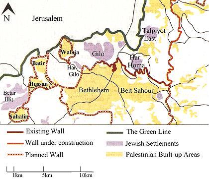 four Palestinian villages on the left: Nahalin, Hussan, Batir, Walaja.