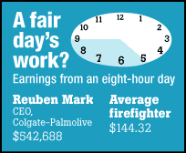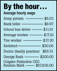 In 1982, the ratio of CEO pay to the wages of an average worker stood at 42 to 1. Today, it is beyond 300 to 1. If the minimum wage had increased as quickly as CEO pay since 1990, it would be $15.71 an hour today. The already huge gap between those at the top of the corporate ladder and the rest of us is hard to comprehend. Think of it this way. In 2003, the average U.S. worker took home $517 in their weekly paycheck, according to the liberal group United for a Fair Economy. CEOs at the largest U.S. companies pocketed an average of $155,769 every week. Leading the Business Week list of CEO looters for 2003 was Colgate-Palmolive CEO Reuben Mark, who banked $141.1 million. Like other top CEOs, most of his compensation came in the form of various stock options--typically, schemes that give top executives the opportunity to buy large amounts of company stock at bargain-basement prices.